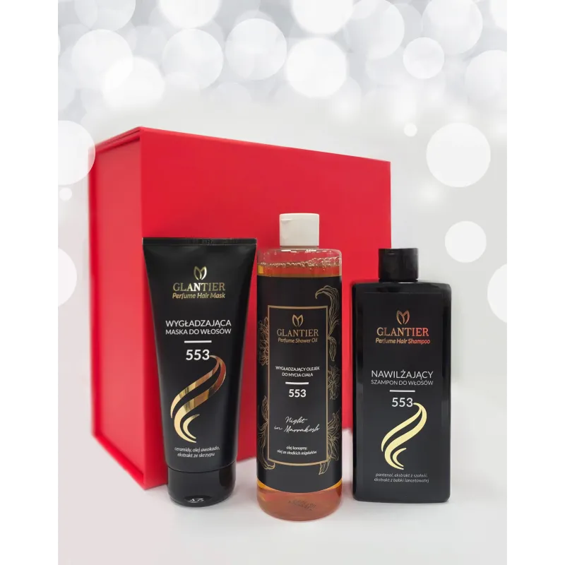 Gift Box z pudełkiem Glantier 553 to szykowny podarunek dla kobiet, które kochają dopieszczający rytuał pielęgnacyjny i eleganckie zapachy. W zestawie znajdziesz trzy pełnowymiarowe kosmetyki o bestsellerowej orientalno-kwiatowej kompozycji: nawilżający szampon, wygładzającą maskę oraz wygładzający olejek do mycia ciała. Wspólnie tworzą kompletny rytuał, który wygładza włosy, nawilża skórę i otula zmysły trwałym, kobiecym aromatem. Całość zapakowana w ekskluzywne czerwone pudełko z magnetycznym zamknięciem (wymiary wewnętrzne: 250×250×120 mm, wymiary zewnętrzne: 262×262×125 mm), dzięki czemu prezent jest gotowy do wręczenia. To idealny wybór, jeśli szukasz eleganckiego, pewnego i efektownego prezentu — zarówno biznesowego, jak i świątecznego czy okolicznościowego.